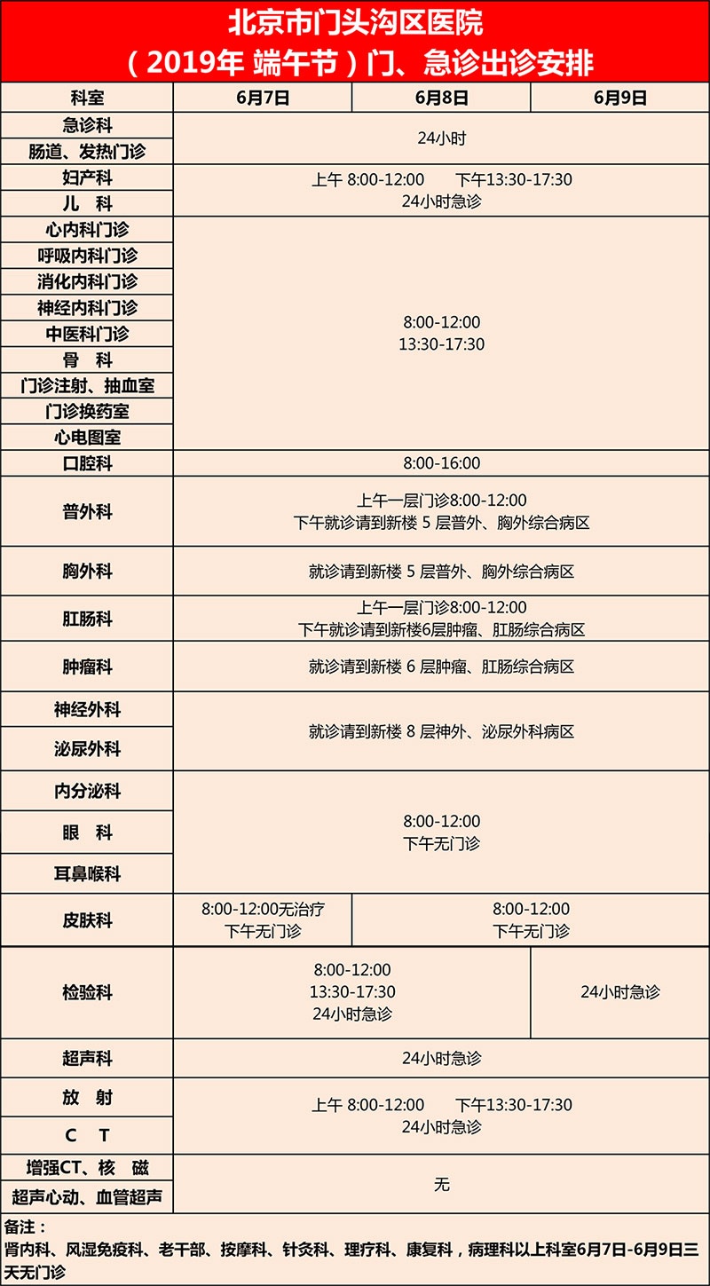 北京市门头沟区医院(2019年端午节)门、急诊出诊安排