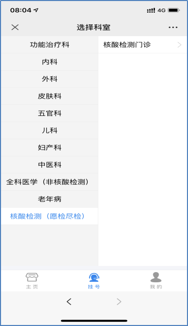 为了方便愿检尽检核酸检测市民的需求,我院于2021年1月28日起,增加服务号核酸预约愿检尽检新渠道,市民可在手机进行操作,并可自主预约7日内核酸检测号源。
