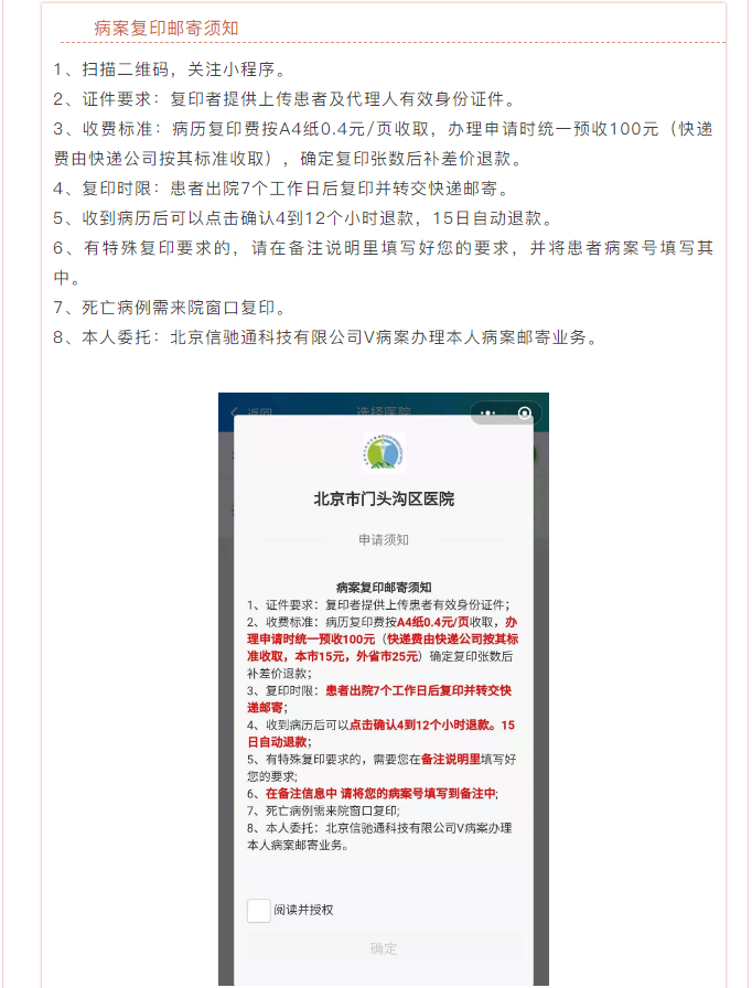 为更好地提升服务质量,便利患者,五月一日后我院推出病历复印“网上预约,邮寄到家”服务,可为出院患者提供病历复印并邮寄到家服务,减少患者往返医院所耽误的时间和路程,只要关注小程序,填写资料直接下单。
