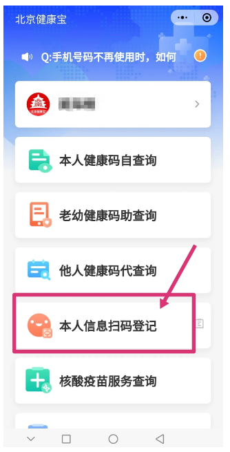 打开微信/支付宝中“北京健康宝”,选择“本人信息扫码登记”,扫二维码后进行电子登记。