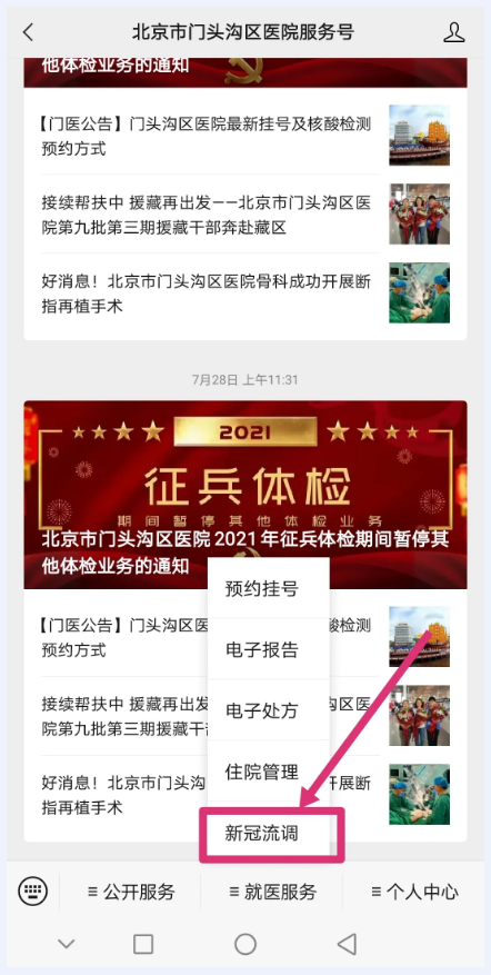 因新冠疫情再次反复,根据北京市新型冠状病毒肺炎疫情防控要求,我院将门诊预检分诊流程调整为“微信扫码+人工预检”及“纸质登记+人工预检”两种模式相结合的形式。请您来诊时准备并出示以下信息: