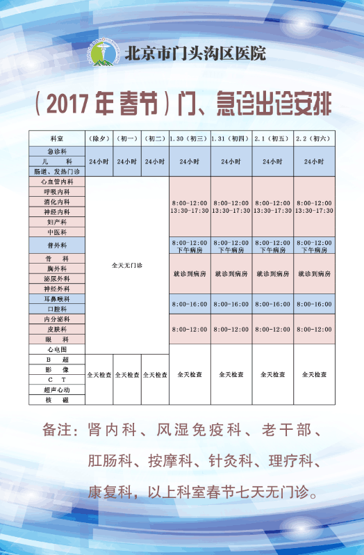 根据《国务院办公厅关于2017年部分节假日安排的通知》要求,结合我院实际情况,春节期间门诊安排如下:
