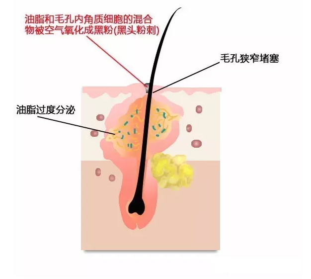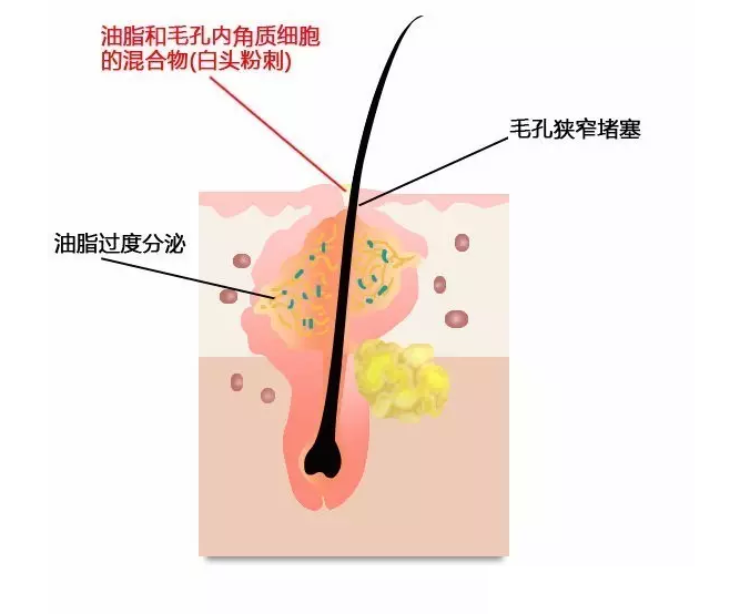 发病机制主要包括四大因素:毛囊及皮脂腺导管上皮的过度角化,微生物尤其是痤疮丙酸杆菌的定植,皮脂腺分泌过多以及炎症反应。最新的研究表明,炎症反应贯穿了痤疮的整个发病周期。