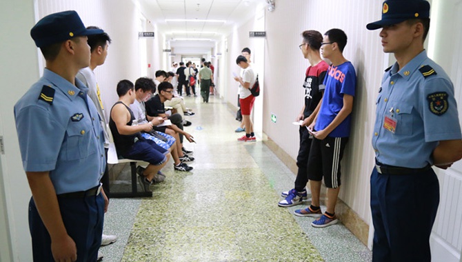 等待征兵体检的应征青年们也已在体检中心的门外集合排队。征兵体检于七点半正式开始。