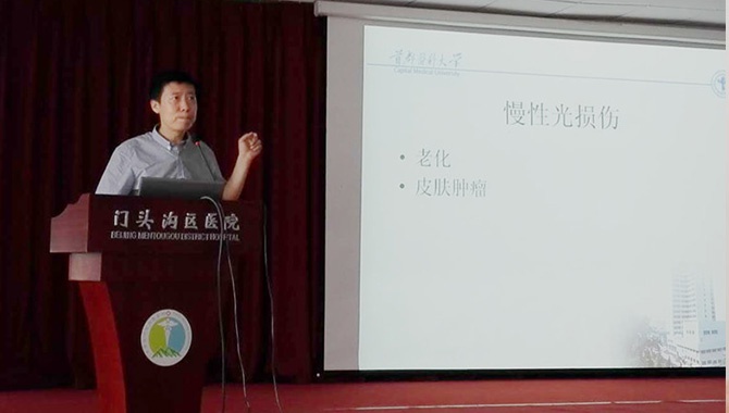 首先由首都医科大学附属友谊医院皮肤科主任李邻峰教授讲解,李教授长期从事临床工作特别是对变态反应性皮肤病有独到见解,具有丰富临床经验。他针对夏季的特点深入细致的讲授了光敏性疾病的原因、分类,临床表现,以及治疗原则、注意事项和最新进展,并把他的临床经验与大家一起分享。对于防晒,李教授介绍了防晒霜使用以及物理防晒的效果等防晒美容知识。李教授讲课诙谐幽默,深入浅出,会场气氛活跃。