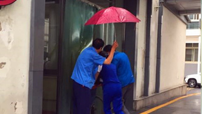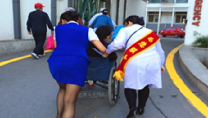 6月22日下午正下着大雨,区医院门诊大厅的医护人员都在岗位上忙碌着,这时纠纷办的孟桂华看到一位患者突然倒地,于是立即到患者服务中心告知这一情况并借来了轮椅。患者服务中心的陈静立刻推着轮椅赶到患者身边,此时患者已无意识,同伴呼唤名字也无任何反应。于是,患者服务中心的陈静,孟桂华,保洁员及患者的家属一起将患者抬到轮椅上,由陈静推着轮椅,保洁员打着雨伞,一起将患者送到了急诊内科抢救室进行救治。