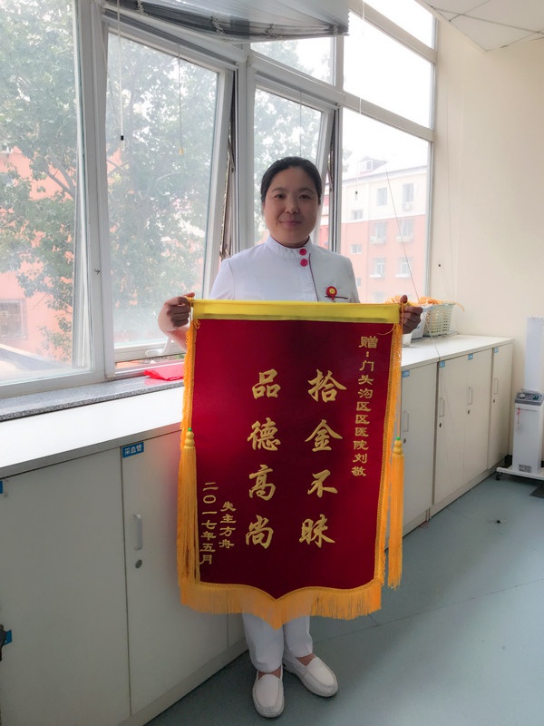 果然没过一会儿,这位患者就满头大汗的赶回到了抽血室。刘敬和同事核对了他的身份信息后把钱包交还给他。失主看到钱包失而复得,激动万分,对刘敬拾金不昧的精神给予了高度赞扬。为表达感激之情,在第二天专程送来了一面锦旗,印有“拾金不昧 品德高尚”。