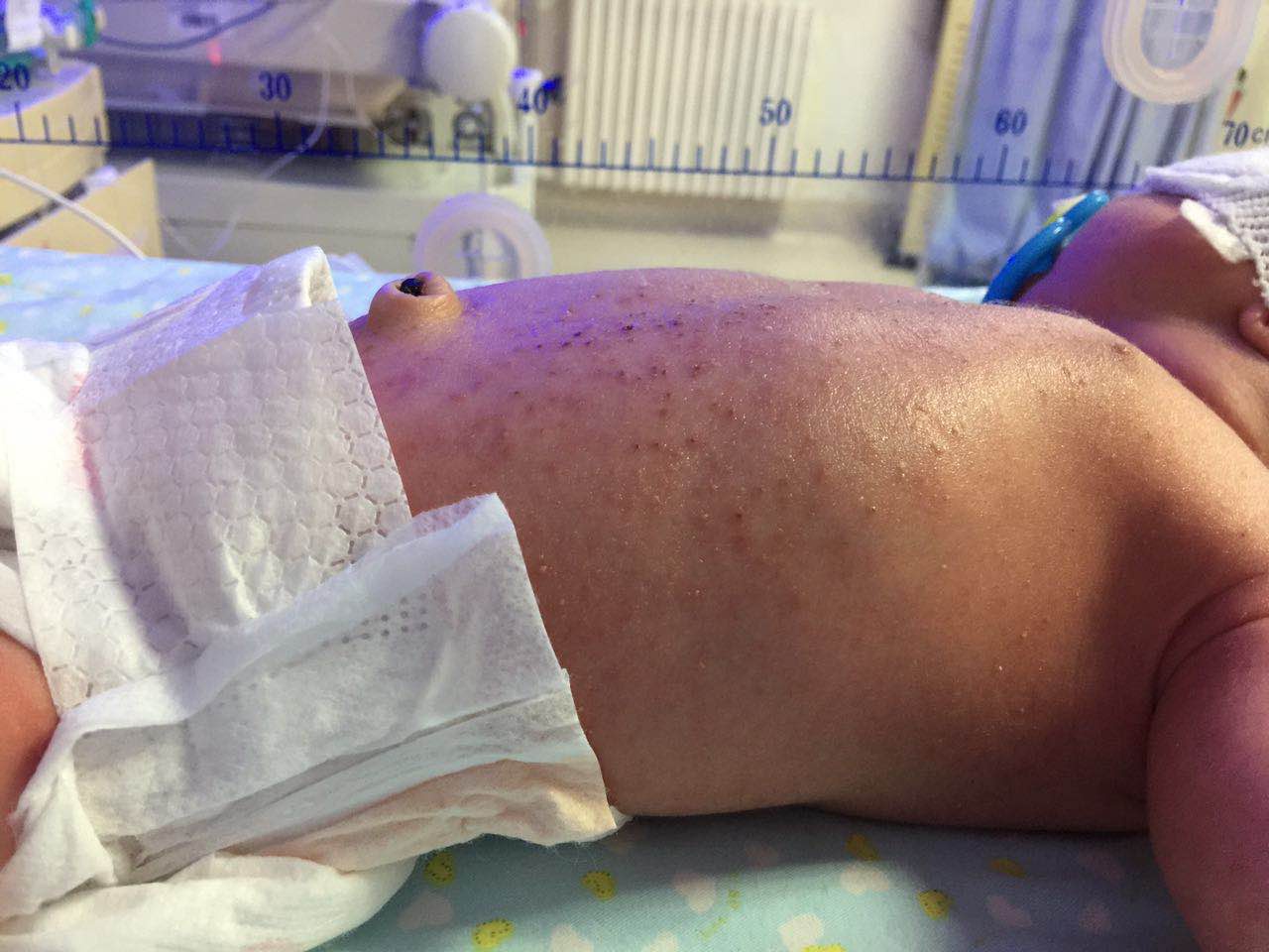这一天,刘主任带着王海波医生一起巡视产科病房时,一名新生儿立即引起了她的注意。这是一名出生2天的新生儿,全身红扑扑的,小脸像苹果一样圆润,不过让医生注意到的是孩子身上布满的皮疹。新生儿出生后皮肤都非常薄嫩,难免会出现一些皮疹,可是这个孩子身上的皮疹数量特别多,而且上面还长出了一颗一颗的黄白色的泡泡。经验丰富的刘主任立刻识别出这是典型的新生儿脓疱疹的皮疹。