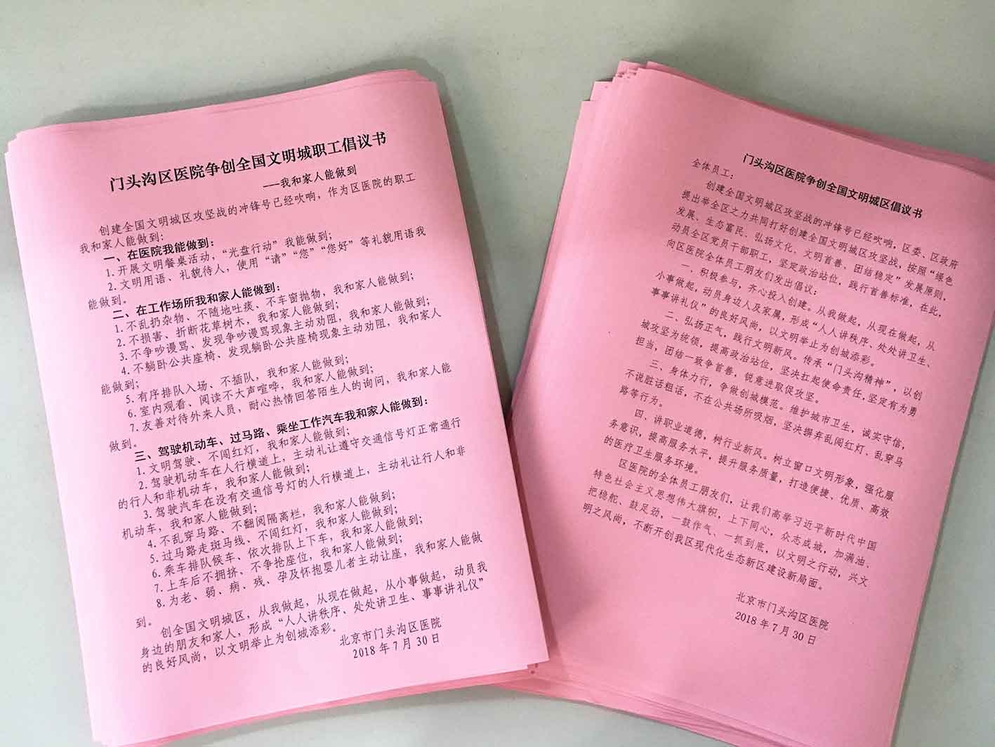 在发放区级创建全国文明城区倡议书的基础上,区医院又面向全体职工和职工家属发放《我和家人能做到——创城倡议书》,号召职工及家属全员参与创建。