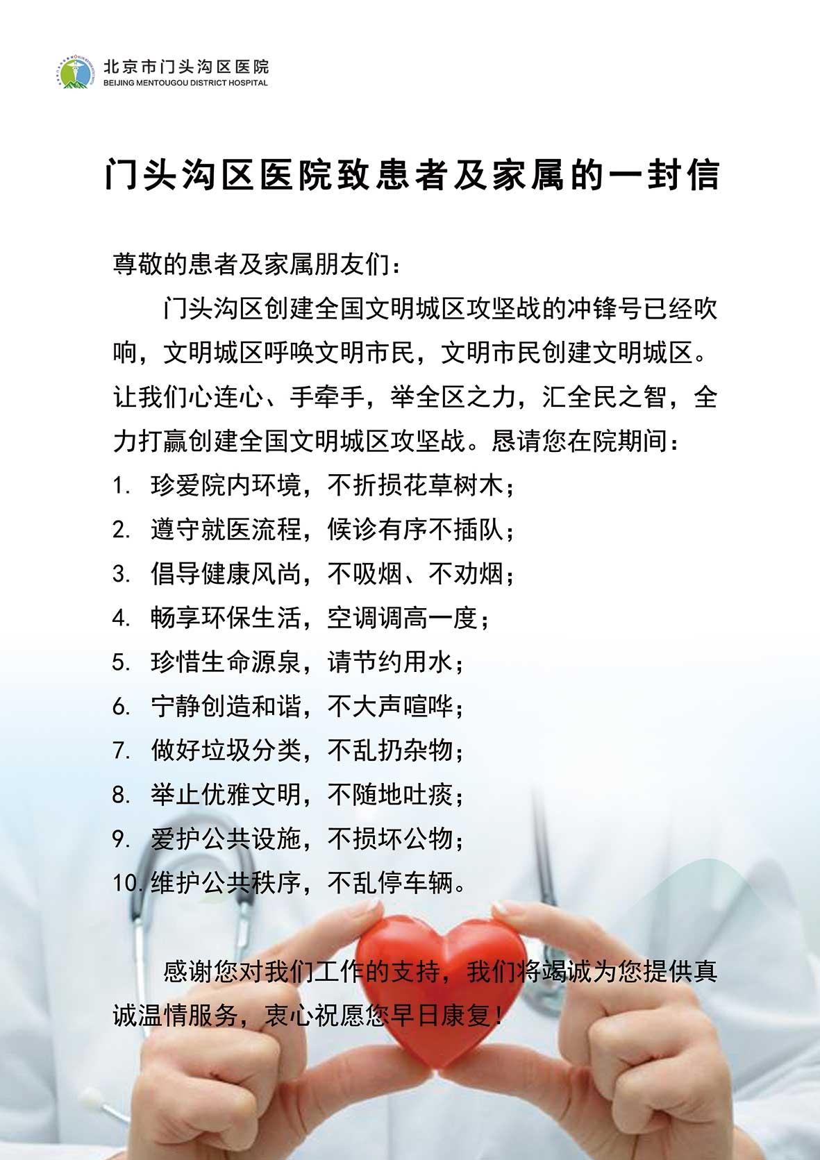 针对病人及家属,区医院在病人入院时进行宣教并发放“致患者的一封信”,号召患者及家属参与创建。