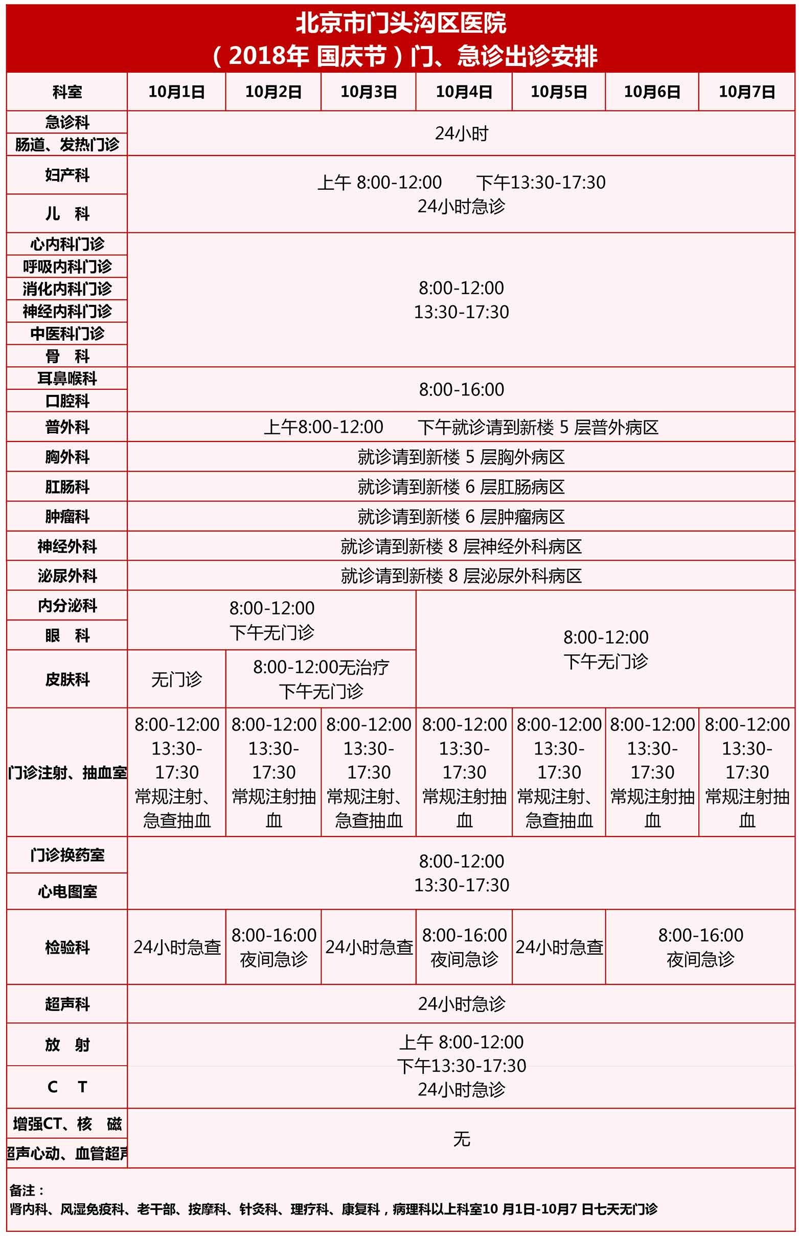 北京市门头沟区医院(2018年 国庆节)门、急诊出诊安排