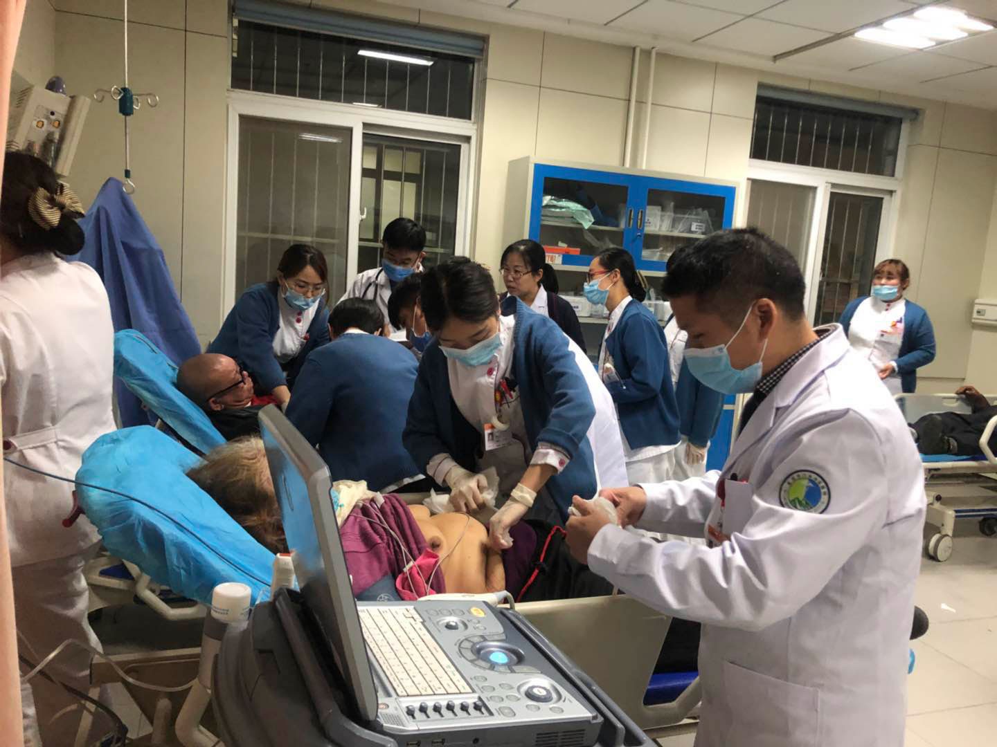 急诊护士长杨伟娜接到命令后第一时间通知总值班,同时通知急诊科做好抢救准备。总值班接到通知后,立即上报值班院长,启动应急预案,开启绿色通道。普外科、胸外科二线值班医生、床旁超声科迅速到达急诊做好抢救准备。