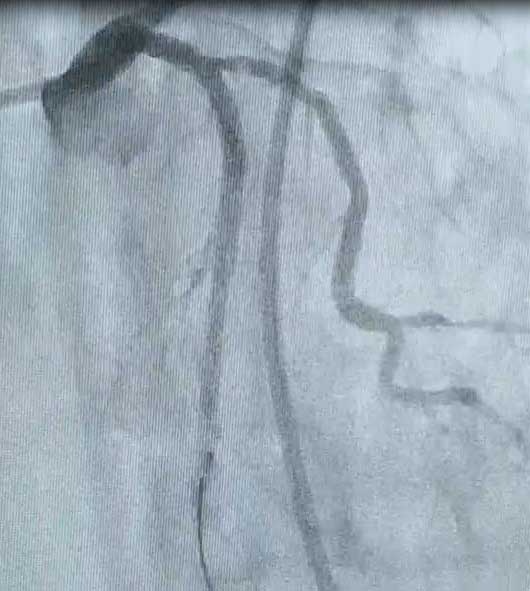 导管室迅速开放,紧急为患者做了冠脉造影,结果显示:前降支中段闭塞!开通前降支并植入支架2枚,患者前降支血流恢复,胸痛缓解,入住心内科CCU继续进行后续治疗。患者转危为安,一场与死神赛跑的生命争夺战以手术的成功完成而告终!