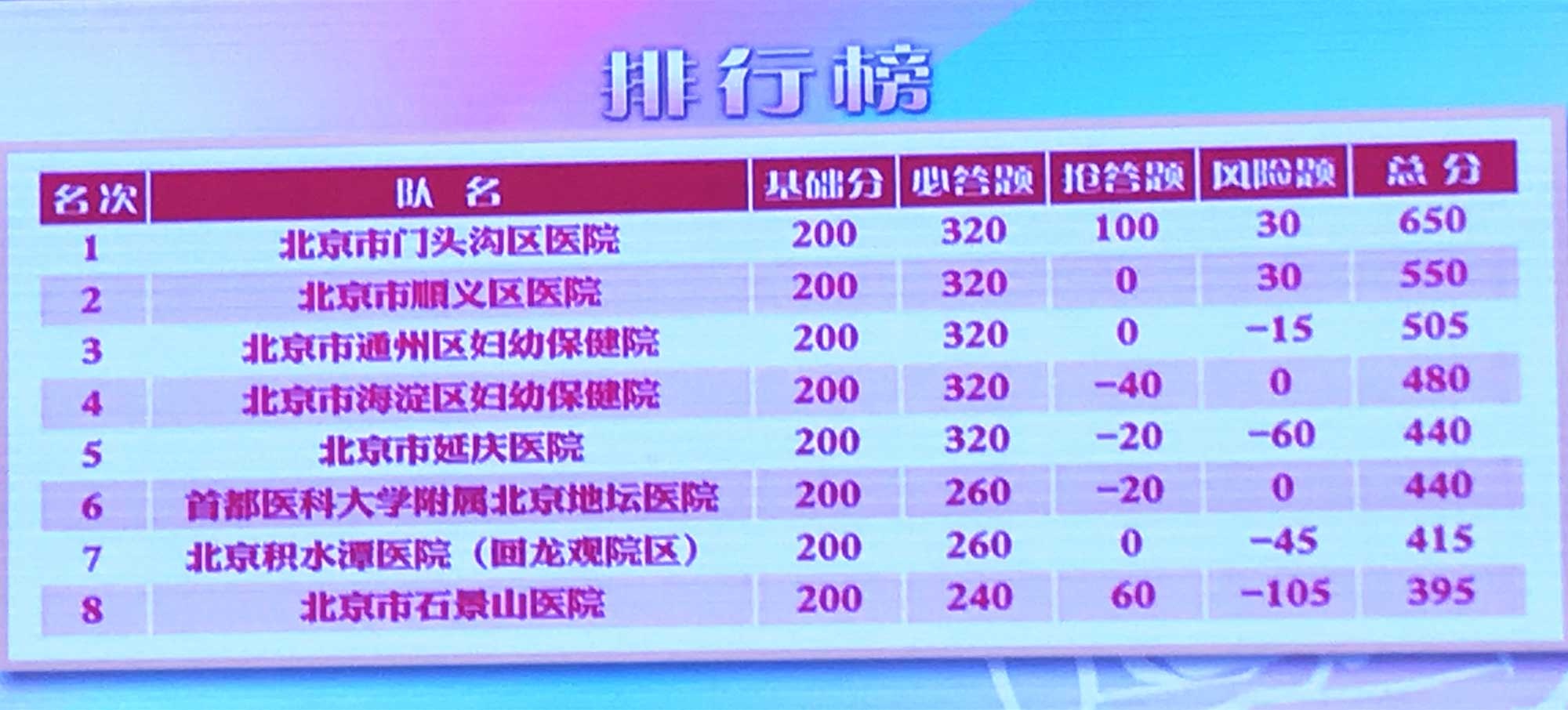 前期,全北京市助产机构参加统一笔试,三级医院及二级医院的前八名,共计16家实力雄厚的助产机构进入决赛。比赛中既要比基础知识,更要比临场发挥和反应能力。区医院妇产科对此次比赛高度重视,在赛前进行了充分准备,最终经过两个小时的激烈角逐,我院妇产科突出重围摘得桂冠。