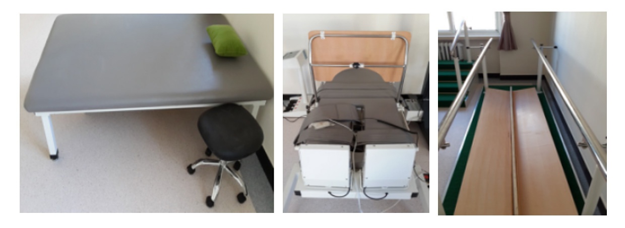 部分训练设备:PT床:肢体训练,翻身,坐起等动作训练;电动起立床:偏瘫患者早期站立、负重练习;平衡杠:行走练习、矫正异常步态。