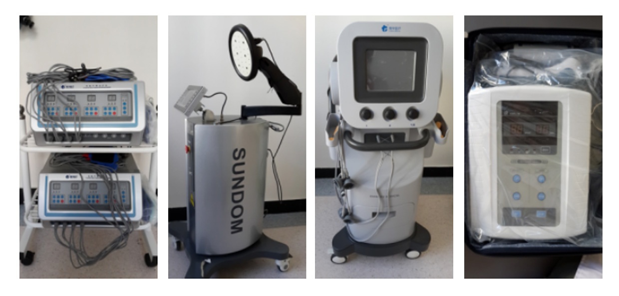 物理因子设备:依次是中频电、半导体激光、干扰电、超声波治疗仪。作用:诱发肌肉收缩、镇痛、消肿、缓解肌肉痉挛、药物离子导入治疗、软化瘢痕等。适用于脑血管患者软瘫期、骨关节疾病患者疼痛治疗、骨折恢复期、减轻术后粘连及瘢痕组织等。